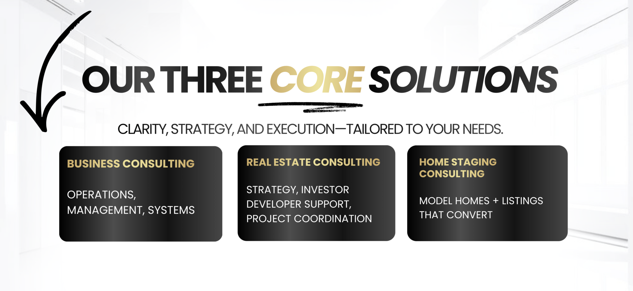 We serve clients nationwide, working with builders, investors, and businesses across multiple states. For in-person services like home staging, we focus on [insert primary regions/cities]. Remote consulting is available anywhere.